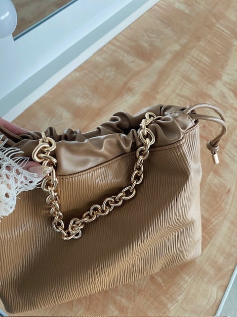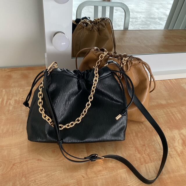 柔らかくて使いやすく、巾着デザインと型押し合皮がこなれ感がでて