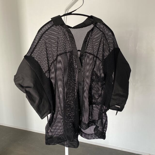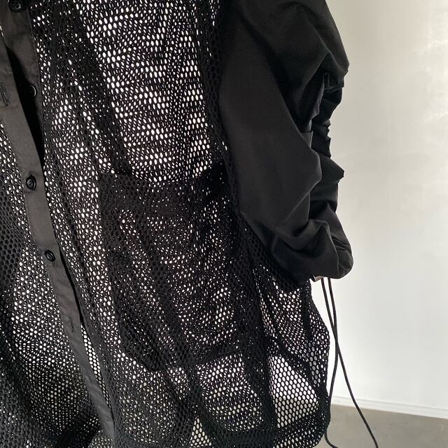 袖の切り替えとドロストデザインが魅力のメッシュブラウス