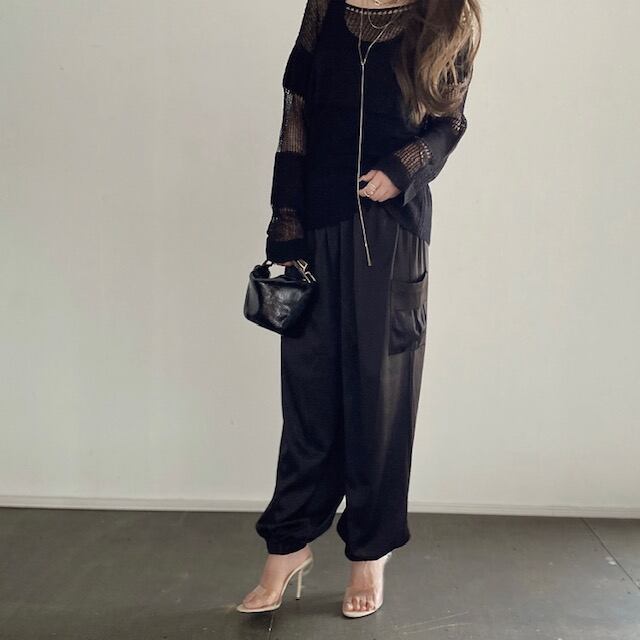 明るさ控えめの大人なサテン生地を使用したサテンジョガーパンツ**