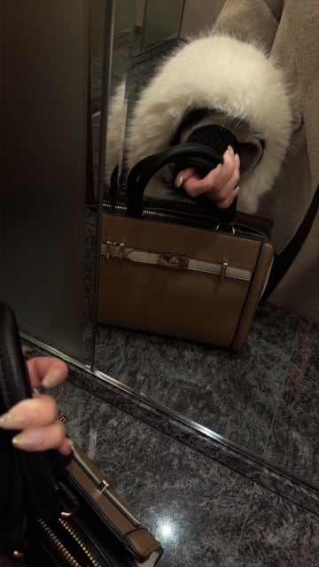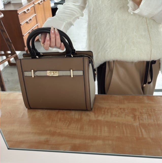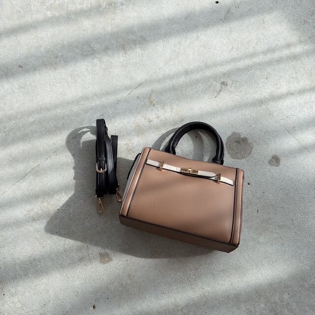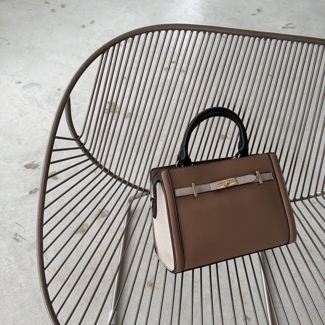 上品なバイカラーベルトが目を惹くハンドバッグ。