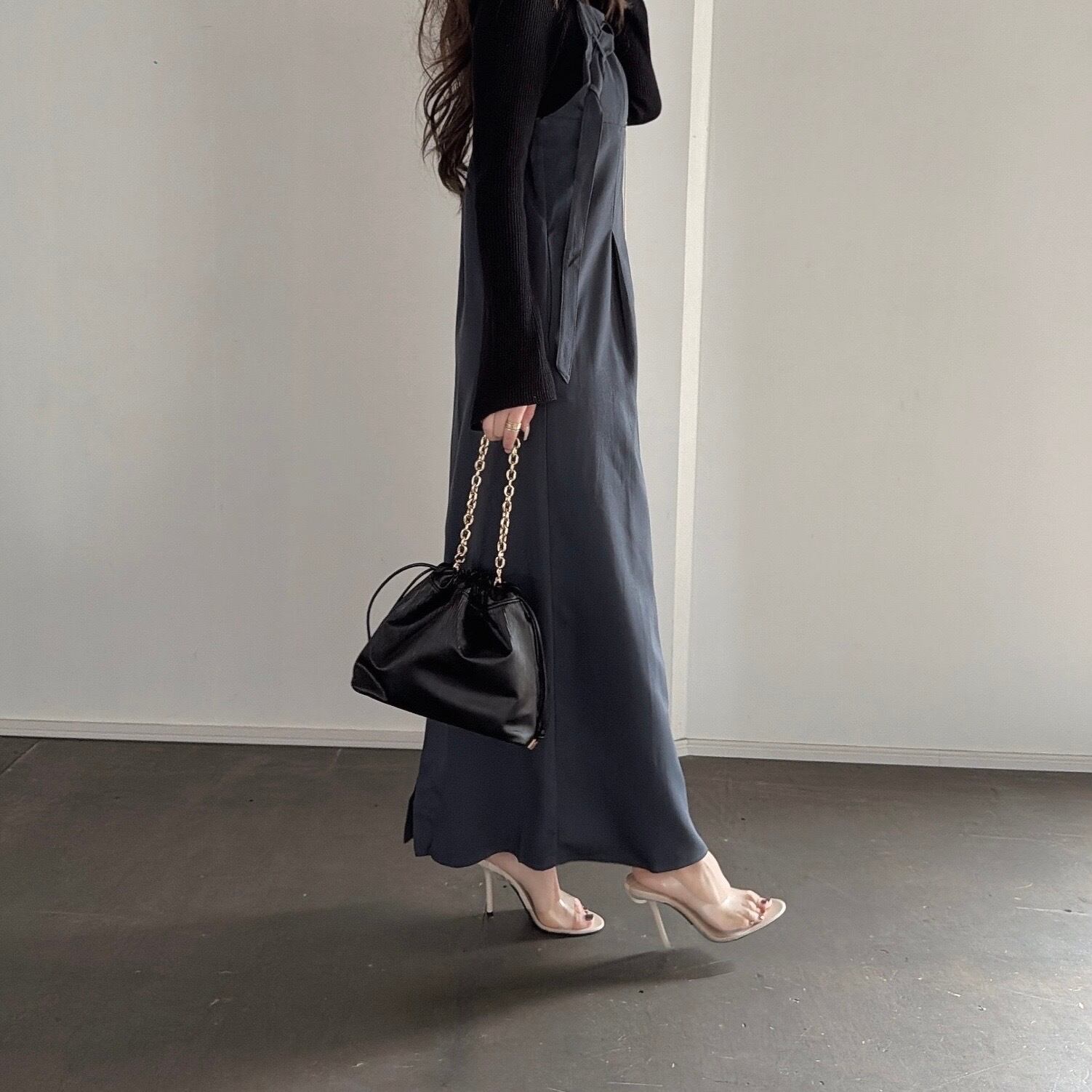 身体のラインを拾いすぎず、縦のシルエットを美しく演出。