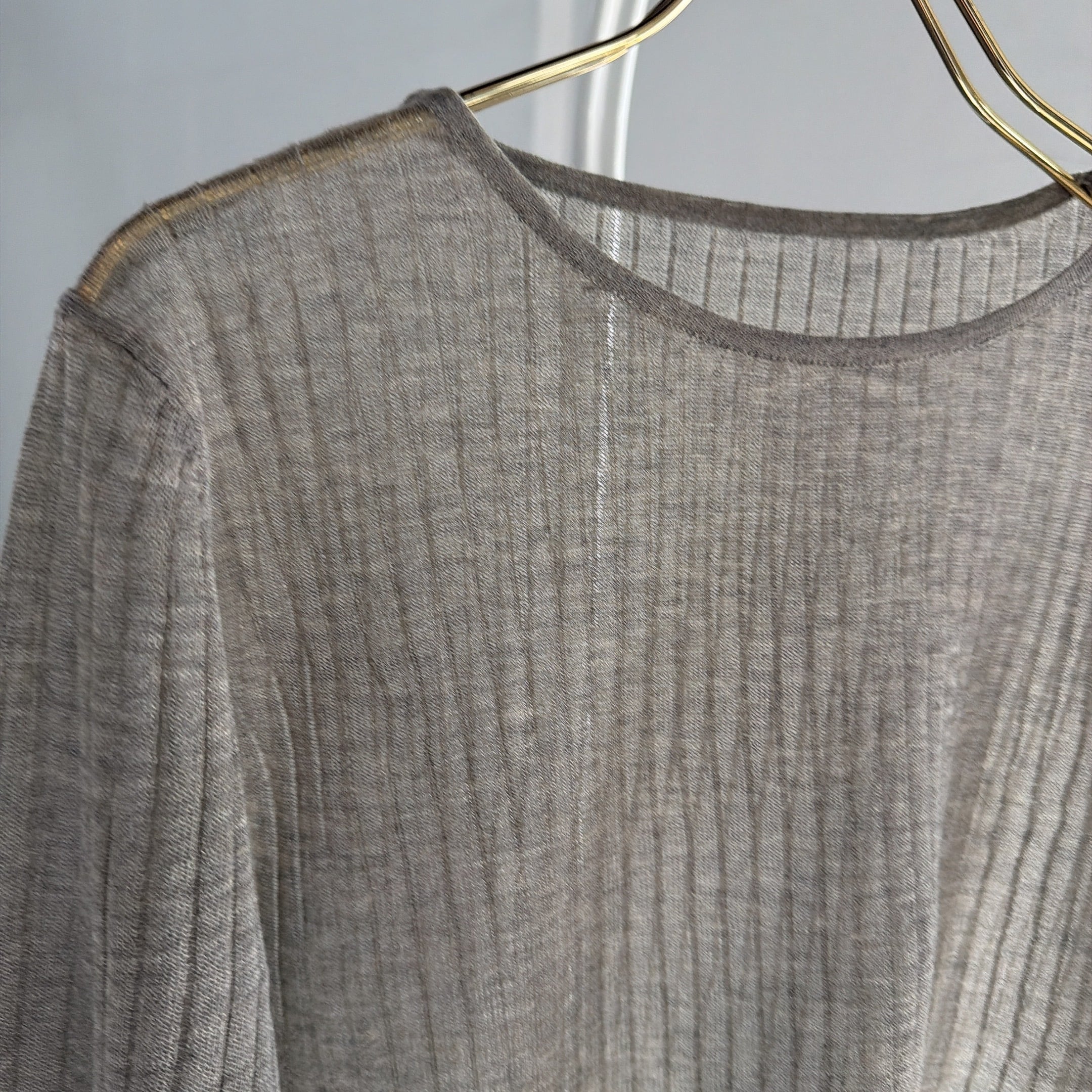 極細のラメ糸が入った糸で編みあげた、シアーリブニットです。