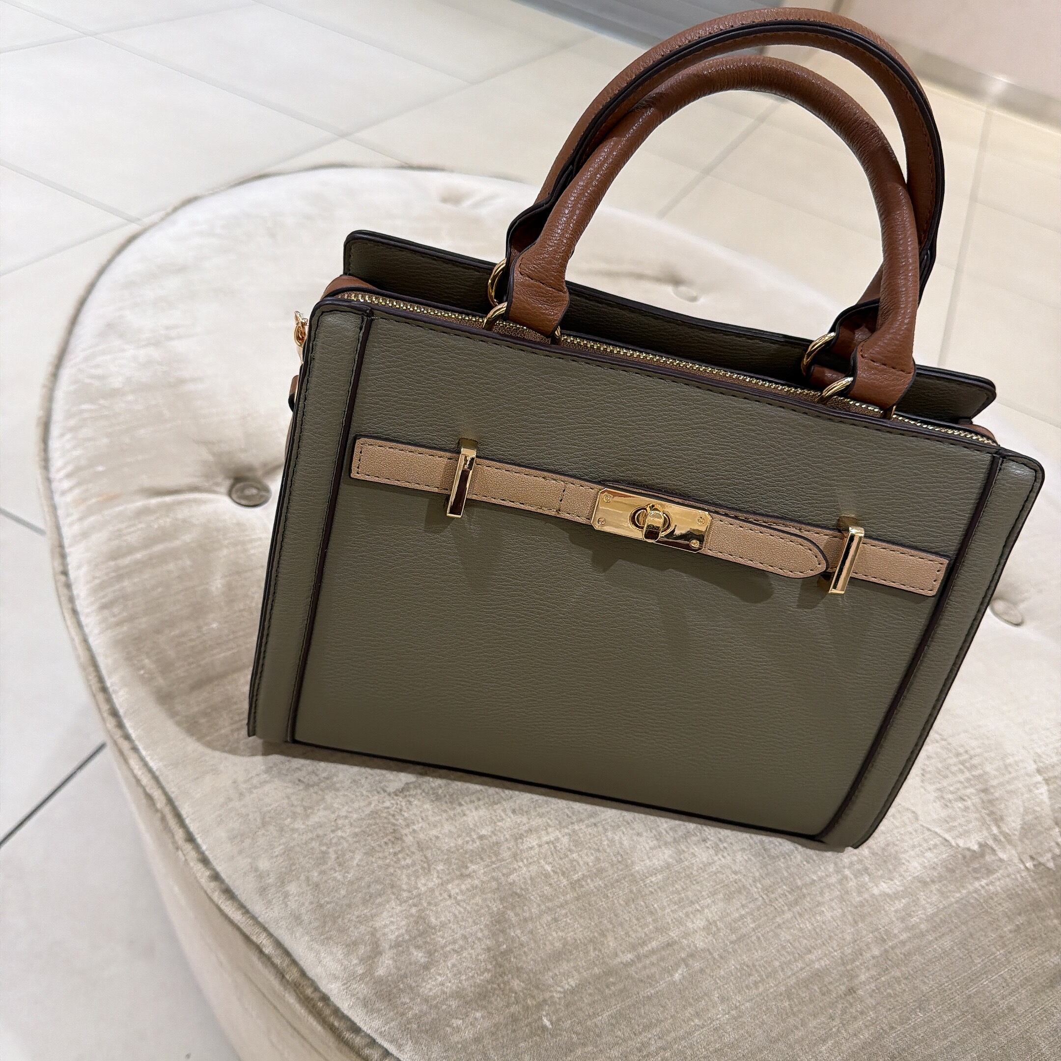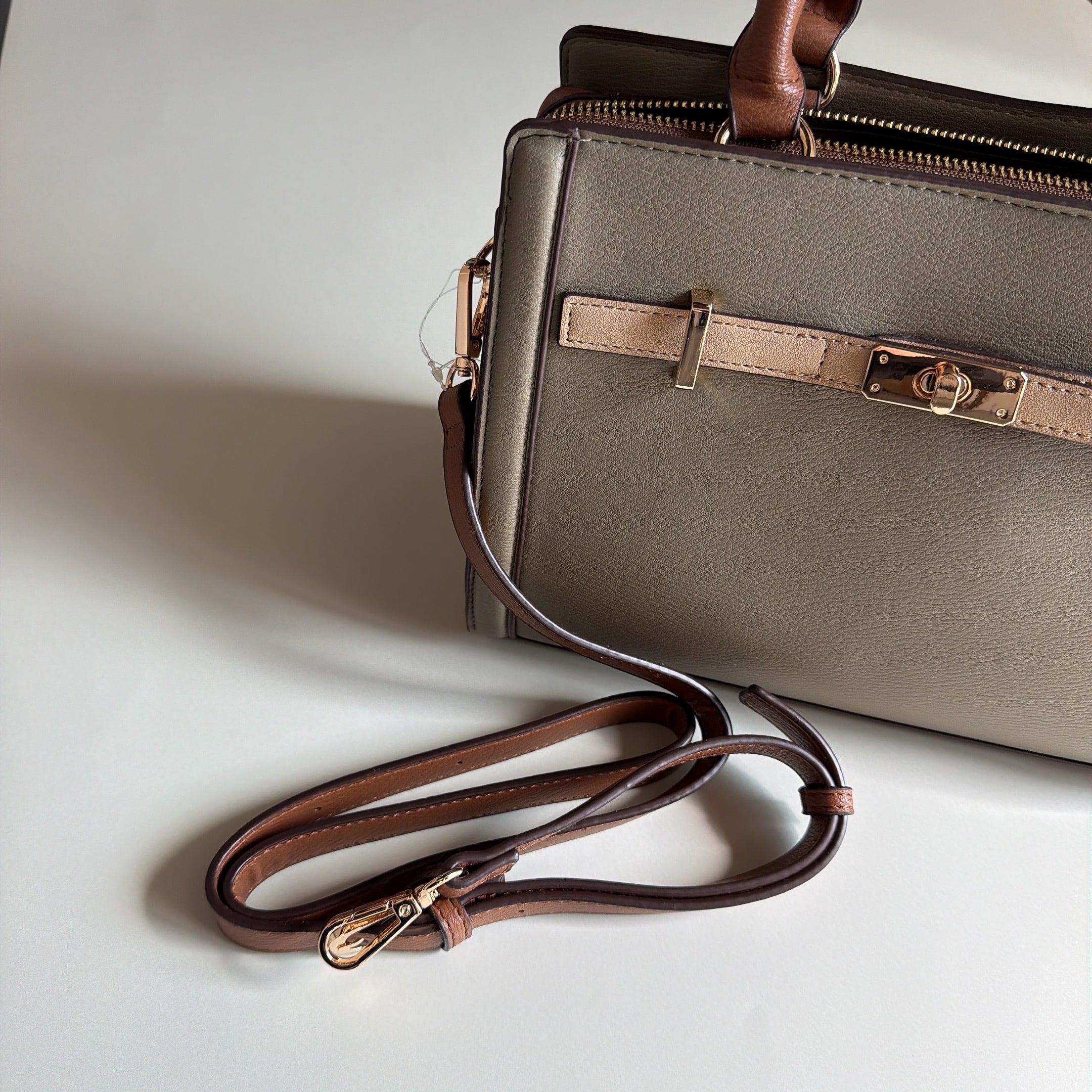 上品なバイカラーベルトが目を惹くハンドバッグ。